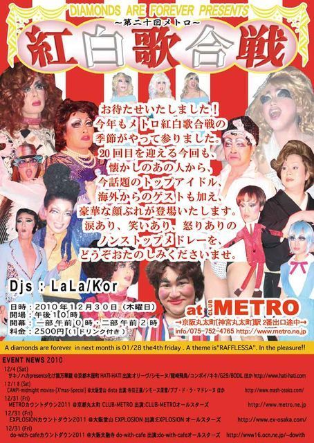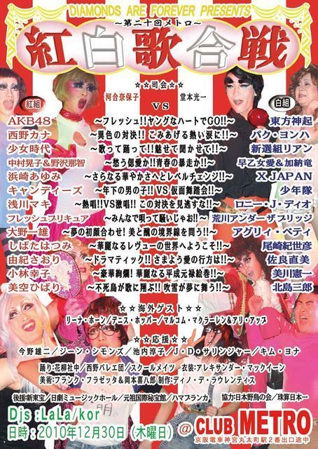 おまたせいたしました! 今年もメトロ紅白歌合戦の 季節がやって参りました。 20回目を迎える今回も、 懐かしのあの人から、今話題のトップアイドル、 海外からのゲストも加え、 豪華な顔ぶれが登場いたします。 涙あり、笑いあり、怒りありの ノンストップメドレーを、 どうぞおたのしみ下さいませ。 日時:2010年12月30日(木曜日) 開演:午後10時 開幕:一部午前0時/二部午前2時 料金:2500円(1ドリンク) DJ:LALA / Kor 出演:シモーヌ深雪/ダイアナ/フランソワ/スカーレット/ノッディー/そよ風さん/アフリ