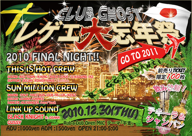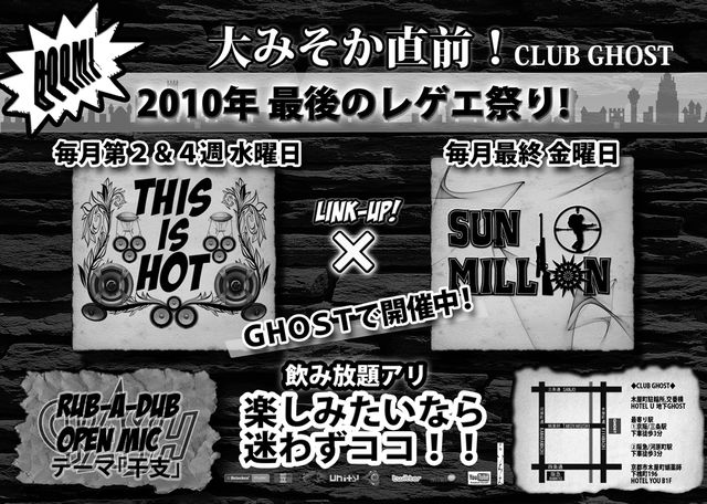 大みそか直前! CLUB GHOST 「2010年最後のレゲエ祭り!!」 テキーラ&シャンパン飲み放題アリ♪ →12月30日(木)は 楽しみたいなら迷わずココ!!← ■GHOSTで毎月好評開催中の 2イベントが年末限定でLINK UP!!! 「THIS IS HOT」 × 「SUN MILLION」 …小箱ながらどちらも100人を動員するなど、 集客力・内容に定評のあるイベントが一夜限りのコラボ♪ さらに! 大阪BIG DANCEレギュラー実力派SOUND BLACK KNIGHT OKUHEI 木屋町六半Ragga Islandからは GUSSY が参戦! まだまだサプライズアリ?! ■RUB-