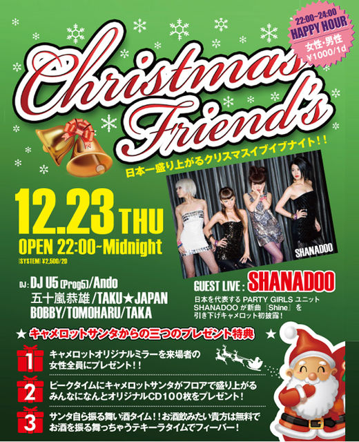 12月23日(木)22:00〜渋谷キャメロットにて http://www.clubcamelot.jp/ 大好評の毎週木曜日「Camelot Friends」が→「Christmas Friends」としてクリスマス特大号でお届けします ゲストのSHANADOOのライブもあり 来場者の女性全員にキャメロットオリジナルミラーをプレゼント ピークタイムにキャメロットサンタがオリジナルCD100枚をプレゼントや 振る舞い酒テキーラタイムも ★ゲストお取りします★ 通常料金2500/2dのところを 連絡頂ければ格安のゲスト料金 男性 1000円/1Drink 女性 1000円/2Drinks サンタ