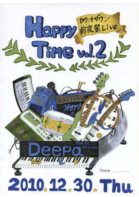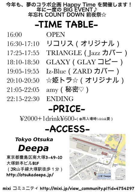 今年も、夢のコラボ企画 Happy Time を開催できる運びとなりました! 年に一度のBIG EVENT☆☆ 【日時】 2010年12月30日(木) 16:00OPEN, 16:30START〜22:30END http://otsukadeepa.jp/live.html?ItemId=3941&y=2010&m=12&d=30&action=form 【場所】 大塚 Deepa (東京都豊島区南大塚3-49-10 大塚鈴本ビルB1F) http://otsukadeepa.jp/ 図解!良くわかるDeepa までの行き方 http://mixi.jp/view_diary.pl?id=1617062585&owner_id=5876491 【入場料】 2000円 +1drink600円〜 ※チケットの取り置きを希望される