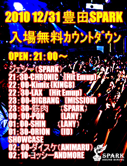 12/31 豊田SPARK【入場無料カウントダウン】 管理人様、告知失礼します。 不適切な場合お手数ですが削除お願い致します。 2010年感謝の気持ちを込めて豊田SPARKカウントダウンはなんと! 入場無料カウントダウン こんなめでたい日にお客さんからお金は頂けません、と店長マコニ−の太っ腹営業 に賛同した地元のDJサウンドアーティストが勢ぞろい! 豊田SPARKの看板DJPONをはじめ名古屋IDでもPLAYするORIONそしてMC筋肉を柱に、 オーガナイザー各イベント看板DJレゲエサウンド