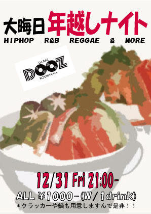 今年は ゆる〜くまったりと クラッカーや鍋も用意します 皆様〜是非 *具材持ち込み大歓迎 <大晦日 年越しナイト> HIPHOP R&B REGGAE & MORE 21:00- <DJ> NOJI PUNCH YASUKI AHHHLLEY CHAY KROW A-MAN disco <MC> ??? <ALL>\1000-(W/1drink)