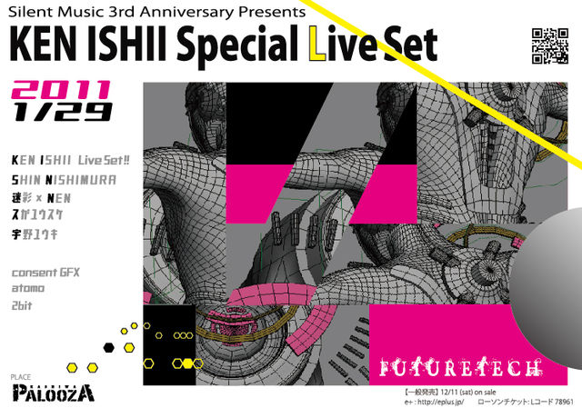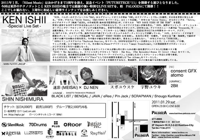 常に進化し続けてきたSilent Musicが3周年を迎え、東洋のテクノゴットことKEN ISHIIが、自身が信頼を寄せワールドレコーディングツアーにも参加したパーカッション岩原大輔氏を引き連れ、日本では数年ぶりとなる本格的ライブを開催する! 更にPLUS RECORDS主宰であり、UK音楽雑誌「IDJ MAG」の「ベスト・テクノチューン」に選ばれるなど日本を代表するテクノアーティストSHIN NISHIMURA、ダンスパフォーマーとしてWIREにも幾度となく出演の迷彩x元迷彩であるDJ NENによるミュージック ショー、柏で成長し2010年LOUD国内DJランキング48位に選ばれ