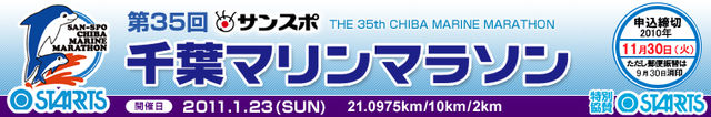 〔第35回サンスポ千葉マリンマラソン 〕 千葉マリンまで2週間です 走り込みや体調・モチベは万全ですか!? 2011年初春のレースです 行き交ったら「イェーイ!!」エール交換 悔いのない走りで千葉マリンを楽しみましょう!! 開催日 2011年1月23日 (日) 開催場所 千葉県 千葉市 千葉マリンスタジアム・幕張メッセ周辺 種目・参加資格 受付時間 8:00(予定)〜各スタート30分前(ハーフは〜40分前)まで 受付場所 千葉マリンスタジアム 受付住所 千葉市美浜区美浜1 開会式時間 8:30 スタート時間 10:00(ハーフ) 10:05(ハーフ) 9:50(10k
