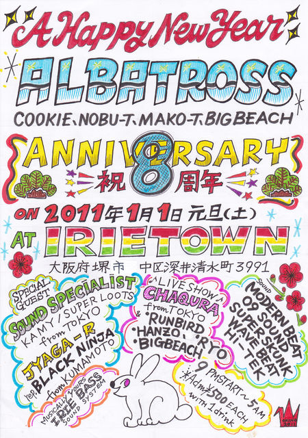 あの夜が再び・・・ IRIE TOWN & ALBATROSS presents [ALBATROSS 8th anniversary] 2011年1月1日(sat)元旦 at.IRIE TOWN http://mixi.jp/view_community.pl?id=3960403 (大阪府堺市中区深井清水町3991) with IRIE BASS soundsystem 21:00〜5:00 ADM 500yen(with 1D) guest sound ★SOUND SPECIALIST (from 東京) ★Jyaga-R.from BLACK NINJA (from 熊本) special live show ★CHAQURA (from 東京) sound ★MODERN BEAT ★09 SOUND ★SUPER SKUNK ★WAVE BEAT ★HI-TEK
