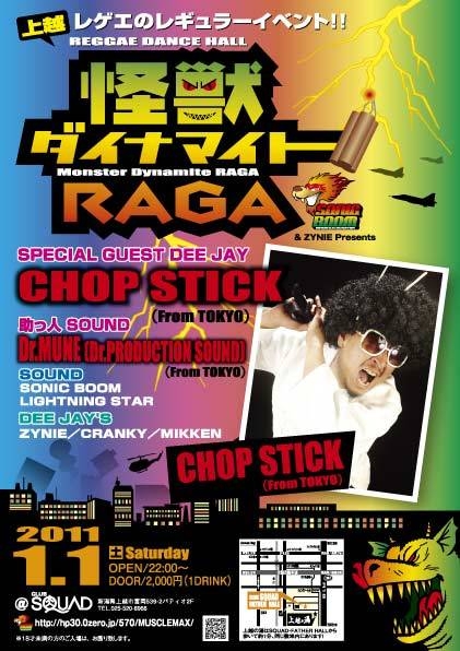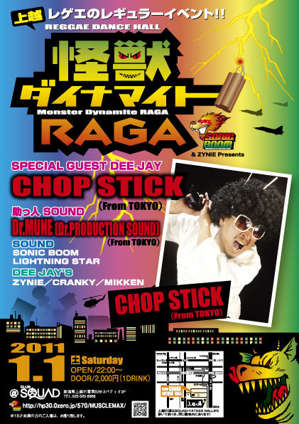 REGGAE DANCEHALL 怪獣ダイナマイトRAGA 【SPECIAL GUEST】 CHOP STICK from TOKYO 【助っ人サウンド】 Dr.MUNE (Dr PRODUCTION SOUND) from TOKYO 【SOUND】 SONIC BOOM LIGHTING STAR 【DEEJAY】 ZYNIE CRANKY MIKKEN 1月1日(土) OPEN 22:00 入場料 ¥2000(1ドリンク付) 【場所】 新潟県上越市パティオ二階[SQUAD] 【問い合わせ】 [ERAL] 025-522-6842 [マッスルエンターテイメント] 090-1372-5339 その他詳し