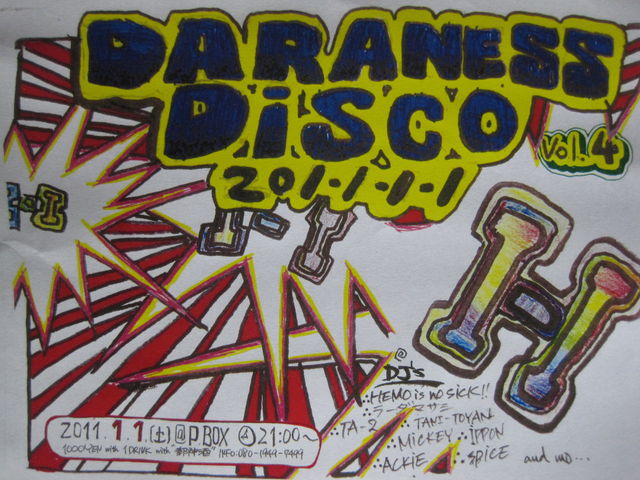 告知お願いします しょっぱなから かっとばします DARRANESS DISCO VOL.4 2011.1.1 元旦 21:00〜 @P.BOX(倉吉パチンコパラダイス2F) 1000YEN with 1drink+お神酒 ○DJ HEMO is no sick ラーダマサシ TA-2 IPPON TANI-TOYAN SPICE ACKIE and mo... お神酒、書初め、漬物、缶詰、かくし芸... 元旦から愉快な仲間たちと楽しくやってます 足元にお気をつけの上、こぞってお越しくださいませぜひ 渡る世間はデンジャラス WATCH YOUR STE