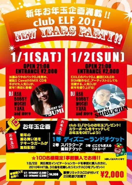 管理人様書き込み失礼致します。 不適切でしたら削除お願いいたします!! ■2011年1月1日土曜日21:00〜 GUEST DJ : JUMI(樹美) 加藤ミリアのバックDJを務め、雑誌 S CawaiiのMIX CDを手掛けた人気DJが新年1発目に登場!! 新年お年玉プレゼント企画 ■お年玉その1 新年の振る舞い酒をテキーラガールが無料配布! ■お年玉その2 club ELFからのお年玉プレゼント!カラーボールをキャッチしてお年玉をGETしよう!! ・1等 ディズニーランドチケット ・2等 スパラクーア無料チケット ・3等 どこでも使えるクオカード ★