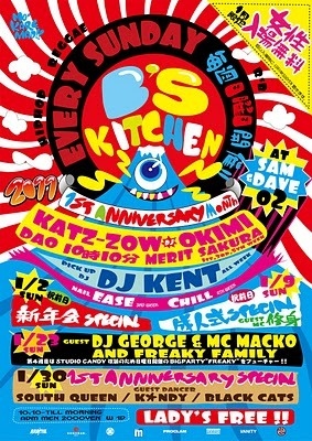管理人様、告知失礼致します。 *お得なディスカウント情報は下の方にありますので、最後までお読みくださいっexclamation ×2 年末年始、酔っ払ってワイワイ騒げるのは実は2日まで・・・ 一連のパーティーの締めくくりは、毎週日曜の鉄板パーティーのこちらでっexclamation ×2exclamation ×2 『B'S KITCHEN』@SAM & DAVE02 (通称:サム2) DJ:KENT, KATZ-ZOW, OKIMI, DAO, SAKURA, 10時10分, MERIT OPEN: 22:00-TIL MORNING ADM: MEN \2,000/w1D WOMEN \500/w1d ((ACCESS)) 心斎橋駅6番出口を降りてすぐ左に曲がります。右手を見なが