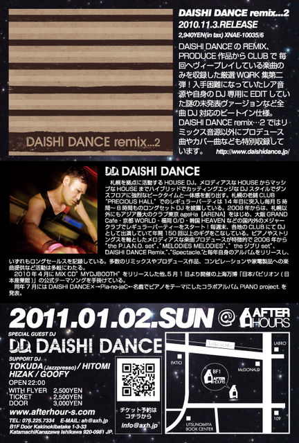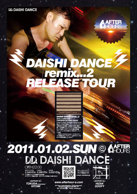 管理人様告知失礼致します。 2011/01/02 DAISHI DANCE remix...2 RELEASE TOUR 5月2日@AFTERHOURSにて開催され、大盛況のうちに幕を閉じた 『MYDJBOOTH RELEASE TOUR』から8ヶ月。DAISHIサウンドが帰ってくる!!!今回は11月3日に発売された『DAISHI DANCE remix...2』のリリースパーティーとして開催決定。会場は@AFTERHORS " THEO PARRISH / Francois K / Larry Heard(Mr.Fingers ) / Derrick May........ など海外ビックアーティストのイベントをも開催している『AFTERHOURS』2011年、最初のビックパーティー『DAISHI DANC