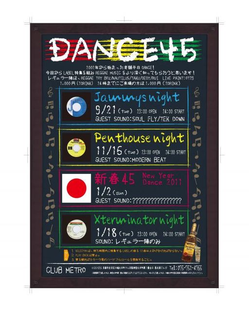 2日は京都で新年会じゃ! “新春45” New Year Dance 2011 2011.1.2(日) at.CLUB METRO 京都市左京区川端丸太町下ル京阪神宮丸太町駅2番出口 恵比須ビルB1F Tel.075-752-4765 =Artist= KURTIS FLY MICHAEL D JILLY =Sound= MODERN BEAT SOUL FLY HI-CREATION ARTICAL KING REGGAE TOY BOX GREETING RYHME TAKU NAUTILOUS RUI DEDY OPEN.23pm START.24pm ADM.\1000-1d 祭りじゃ わっしょい