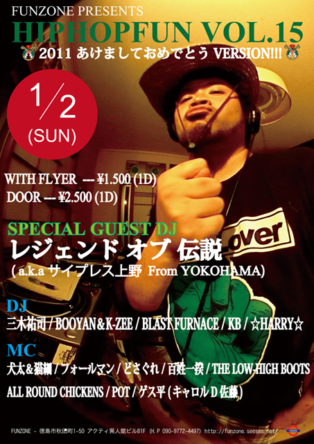 あけましておめでとうございます! 年末のカウントダウンも盛大な盛り上がりをみせ、面白くなっていきそうな2011年を感じました!! さて、新年一発目のイベントの紹介です。 新年一発目はゲストに、カウントダウンでもMCでフロアを盛り上げに盛り上げてくれたにサイプレス上野が、DJレジェンドオブ伝説として出演!!! DJレジェンドオブ伝説は抜群に選曲ヤバいです!!必見!! もちろん徳島からの出演者も新年からぶっかまさせていただくつもりです 正月をダラッと過ごしてお暇な方は是非、徳島FUNZONE−『HIP HOP FUN』まで遊びにきてくだSai!!!