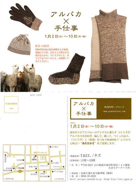 皆様2011年を迎える準備はお済ですか!? tazz./タズは、大掃除も終わり、レイアウトも変更し、新年から行う展示会の チェックも終わり、ひと息ついております。 2011年は、2日から営業します!! ◇◆新春企画『アルパカ×手仕事 展』を開催します!!!◆◇ 1月2日〜10日まで アルパカ素材のニット製品の展示販売を行います。 作品は昨年も好評だったブランド【PUENTE/プエンテ】からです!! 素材良し・デザイン良し!でも値段はひかえめです!!!!!!! 作品数は250点以上!? 手袋からセ