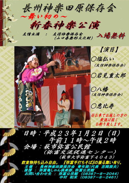 長州神楽田原保存会 〜舞い初め〜 新春神楽公演 弥富中学校で神楽を行った若手が、少しずつ集まってきて、また、神楽の灯がともり始めました。 新春の弥富にあかるい光が差すように、舞初めを行います。 山口県の無形文化財に指定されている小川の友信神楽の協力を得て、4演目を行います。 【演目】 ○塩払い (友信神楽保存会) ○岩見重太郎 (長州神楽田原保存会) ○八幡 (友信神楽保存会) ○恵比寿 (長州神楽田原保存会) 日 時 平成23年1月2日(日) 11:00