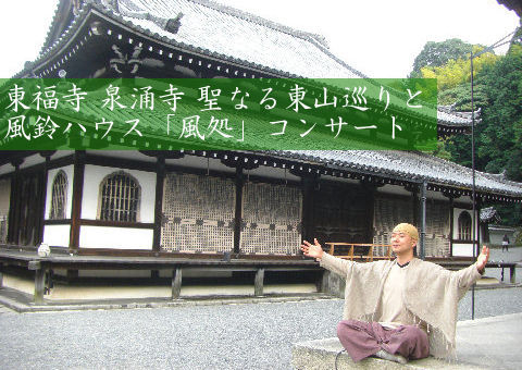 新年 泉涌寺初詣と風処コンサート 2011年の年初めに、しっとりと落ち着いた御寺(みてら)泉涌寺初詣と、風鈴ハウス「風処」の130個を超える風鈴と民族楽器、シンセサイザーによる、四季をとおして聴ける癒しのコンサートを一緒に楽しみましょう。 日時:2011年1月4日(新月) 10時00分〜17時00分 場所: 裏東山(京都) 定員: 7名(先着順) 料金: 4850円 参加者全員に「DVD土と風と人と(2500円)」をプレゼント。 伊集院昭のゆらぎの灯りの陶器映像と風鈴ミュージックのコラボレーションDVD。 個人