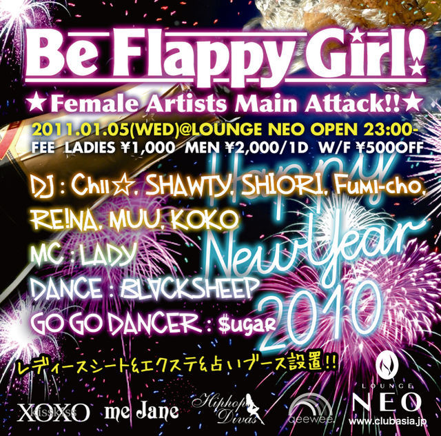 告知失礼します! 2011.01.05(WED) Be Flappy Girl!vol.6 @LOUNGE NEO LOUNGE NEOの新年1発目は2010年8月からスタートしたDJ ATSUプロデュースの“Be Flappy Girl!” DJ、ダンサー、出演者は全て女の子!! 渋谷LOUNGE NEOから発信される "女子力・120%"パーティー 毎回女性にも男性にも楽しんで頂けています レディースシートや「エクステ&占い」ブースも設置ですのでこちらもぜひお楽しみ下さい\(^o^)/ ★メッセージ頂けましたらゲスト料金にてご入場頂けますので、 お気軽にメッセージ下さい ま