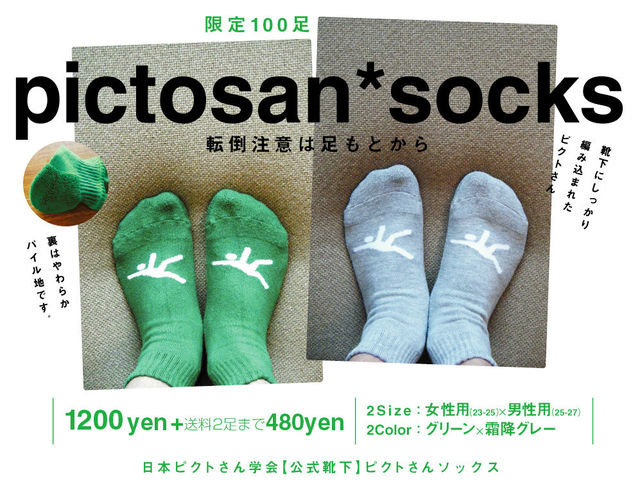 通販分は完売です。ありがとうございました! ジュンク堂書店新宿店6F&池袋店7Fにて [23-25cm]グリーン&霜降グレー販売しております。 そちらもよろしくお願いいたします。 ---以下通販受付時の告知です--- ピクトさんの靴下【ピクソックス】です。 やっぱり転倒防止には足もとからと思いまして ピクトさんにしっかり編み込まれていただきました。 ピクトさんによる転倒防止お守り効果に加え、 内側のパイル構造が足への衝撃をやわらげます。 実際、履き心地すっごくイイです。 いつもは受注生産してますが、 今回はもうつくっ