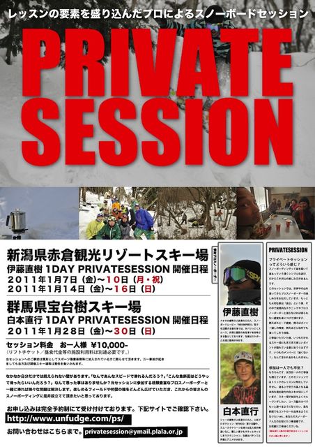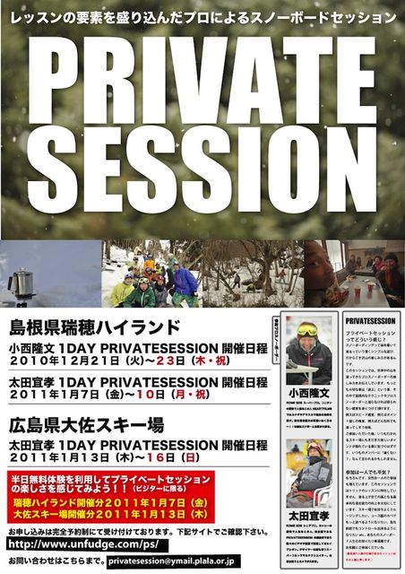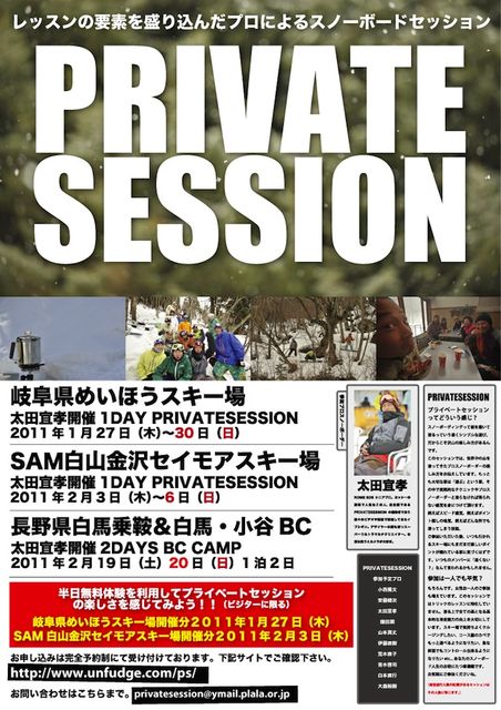皆さんこんにちは。 ROME SDS 太田宜孝です。 PRIVATESESSIONの開催地が続々と決定しております!! 今回ご案内するのはこちら!! 新潟県赤倉観光リゾートスキー場開催 2011年1月8日(金)〜10日(日) 2011年1月14日(金)〜16日(日) 参加プロ 伊藤直樹 四国発〜長野県白馬乗鞍&小谷バックカントリー (他県からのご参加も可能です。その場合、現地集合解散となります) 2011年1月24日(月)25日(火)1泊2日 参加プロ 山本真丈 群馬県宝台樹スキー場開催 2011年1月28日(金)〜30日