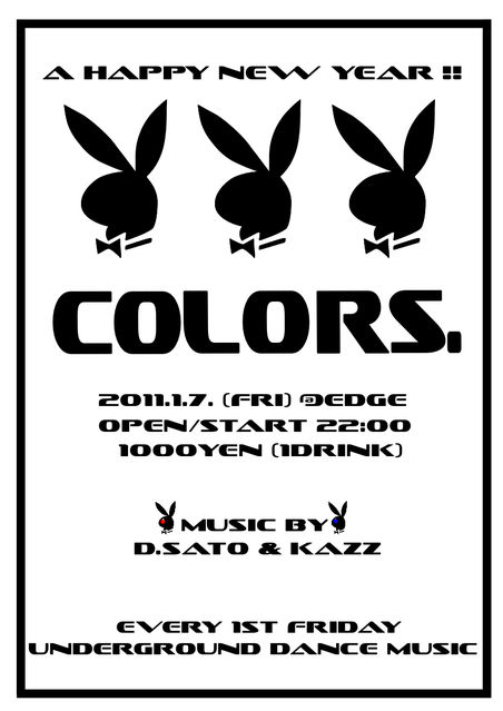 あけましておめでとうございます。 edge第一金曜のCOLORS.です。 今年もよろしくお願いいたします。 ☆COLORS.☆ 2011/1/7/Fri @bar edge ■Open/Start 22:00 ■1000Yen (With 1Drink) ■Music By D.Sato & Kazz □Underground Dance Music Detail : House_Techno_Disco... http://www.d-colors.jp/