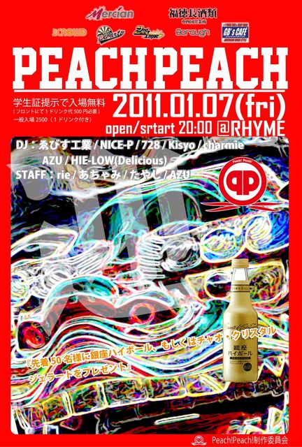 管理人様貴重なスペースお借りします 新年あけましておめでとうございます 1月7日は学生証提示で無料のPeach!Peach!ですよ 2011年1発目のプレゼントCDはPeach!Peach!のマドンナがセレクトしましたイヤホイ 先着50名なんで早い者勝ちですよ 20時OPENなんでお間違えなく 01月07日(金) Peach! Peach! 1月号[HIPHOP R&B Reggae House] @okayamaRHYME START:20:00〜 DJ:ゑびす工業/charmie/NICE-P/728/KISYO/AZU/HIE-LOW(Delicious) STAFF:rie/あ