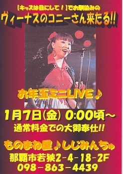 新春お年玉企画イベントと題しまして、1晩1ステージ限りのプチライブをパックリ貝催いたします 【キッスは目にして】でお馴染みの【ヴィーナス】の女性ボーカル【コニー】さんをお迎えしちゃいます お年玉企画だけあって、通常料金での御提供ですのでお早めの御予約お願いしまんぐ〜す 日時: 1月7日(金) 0時頃〜 1ステージ システム: 通常料金での出血大サービス 限定30名様です 御予約・お問い合わせは… 【ものまね屋しじみんちゅ】 那覇市若狭2-4-18-2F