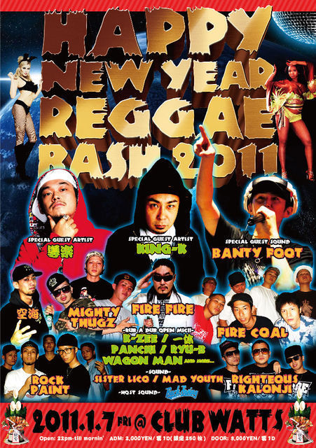 告知失礼します。 四年目に突入するハッピーニューイヤーレゲエバッシュ! 来年も豪華キャストにて開催決定☆ 新年一発目のBIG DANCEを見逃すなっ!! HAPPY NEWYEAR REGGAE BASH2011 2011/01/07(FRI) @club WATTS (Access:佐賀市愛敬町4-10) Open 22pm-till mornin' 前売:2000YEN/要1D (限定250枚) 当日:3000YEN/要1D -SPECIAL GUEST SOUND- BANTY FOOT FIRE炎FIRE FIRE COAL MIGHTY THUGZ -SPECIAL GUEST ARTIST- KING‐K 導楽