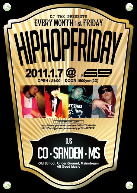 DJ-TAK presents 『HIPHOP FRIDAY』 ■2011/7 fri ■OPEN 21:00- ■@LUZ69 ■DOOR 1500yen(2D) ■DJs TAK (PROPSPOT) CO (PROPSPOT) SANDEN (PROPSPOT) Ms (HIGH LAND) ☆DJ-TAKがプロデュースする金曜日のHIPHOP partyは土曜日だけじゃありません!! 華の金曜日とは過去の言葉でもございません!! 毎週第一華金を華やかに彩る面子をセレクト致します! WEEKEND TOTTORI 間違いない夜をあなたに。