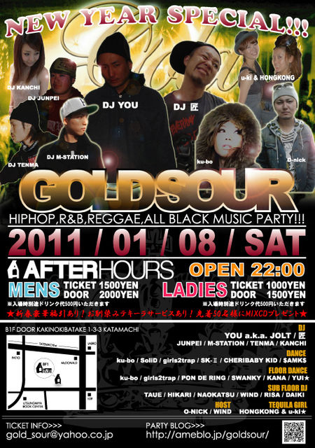 告知失礼します。 奇数月第2土曜日の金沢の夜を熱くさせているPARTY! GOLDSOUR! HIPHOP,R&B,REGGAE,ALL BLACK MUSIC PARTY!! 【GOLDSOUR】 ★NEW YEAR SPECIAL★ @AFTERHOURS 2011/01/08(SAT) OPEN 22:00 [LADIES] TICKET 1000YEN DOOR 1500YEN [MENS] TICKET 1500YEN DOOR 2000YEN ※どちらも入場時別途ドリンク代500円いただきます 新春豪華特典が当たる福引あり! 先着50名様にオリジナルMIXCDプレゼント! お馴染みテキーラサービスあり! ■DJ■ YOU / 匠 / JUNPEI / M-STATION / TENMA / KANCHI ■SUBF