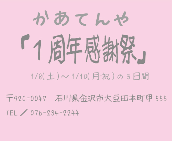 「1周年感謝祭」開催のお知らせ 来る2011年1月、かあてんや金沢本店は大豆田本町に移転して1周年を迎えます。 1年間のご愛顧に感謝し、1/8(土)〜1/10(月・祝)の3日間、金沢本店にて「1周年感謝祭」を開催します。 手作り小物の展示・即売会や、カーテン生地のハギレ詰め放題等も行いますので、皆様お誘い合わせの上お越しください。 10時〜6時 http://www.curtain-ya.com/