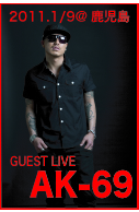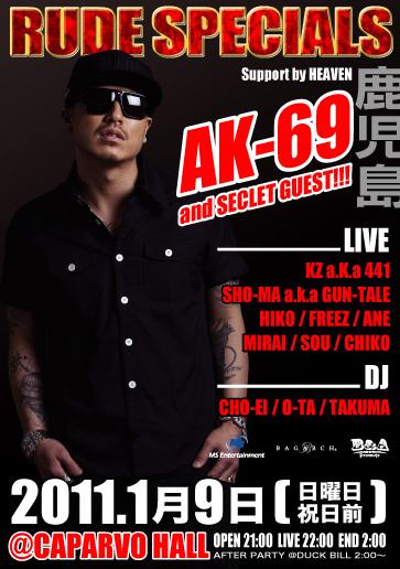 AK-69が鹿児島に来ます! 『AK-69』が新年1月9日(祝日前)に天文館のCAPARVO HALLでLIVEです!!! しかもシークレットには!? 時間も祝日前だけど早めに終わるので誰でも楽しめるし、終わった後はAFTER PARTYがDUCK BILLで!サプライズも有る!? イベントタイトル:RUDE SPECIALS [Support by HEAVEN] GUEST LIVE:AK-69 & SECLET GUEST 開催日:2011年1月9日日曜日 開催地:CAPARVO HALL OPEN21時 / LIVE22時 前売り料金:¥3,000 / 当日券料金:¥4,000 前売り発売日:12月4日 土曜日 前売りチケットはロー