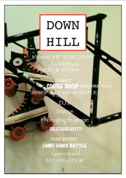 [DOWN HILL] 1/9(SUN) @R° 鹿屋市共栄町ニューワールドホテル隣 day 1000yen start20:00~ DJ's AKATSUKI 外園和久 1917 ポール etc... DANCE KURARA DA FAMILIA(@fukuoka) PHOTOGRAPH(SKATE&GRAFFITI) 坂元塁 Support.Brand INVESTIGATOR ~~~~~~~~~~~~~~~~~~~~~~~~~~~~~~~~~~~~~~~~~~~~~~~~~~~~~~~~~~~~~~~~~~~~~~~~~ [DOWN HILL] 午後3時からリナシティ水辺ステージでランプ、ボックスを置きDJが音楽を流しながらスケートセッションをします☆ 参加者はスケーター、BMX、PIST、インライン