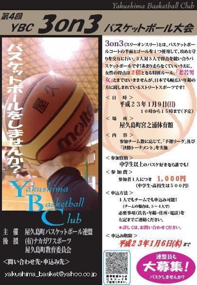 屋久島町でのバスケットボールの普及とスポーツを通じた親睦を図ることを目的として、2008年から始めました新春の3on3もお蔭様で、4回目を向かえることとなりました。 バスケットボールは、体力がないとなかなか大変なところもあります・・・ そこで、コートの半分しか使わない3on3でバスケットボールをすることにより、男女問わず、いろんな年代の人に楽しんでもらおうというのが趣旨です。 なんと、中学生、女性、50歳以上の人にはハンデが付くので、みんなが楽しめるというのが魅力です♪ 昔バスケットボールをやっていた人、これから