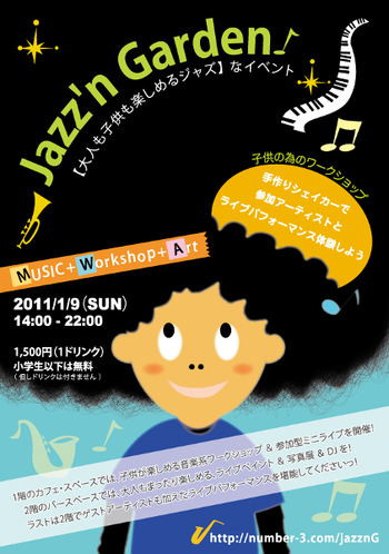 【Jazz'n Garden】 沖縄市パークアベニュー近くにあるカフェ3(一階) & バースリー(二階)にて、JAZZパーティー開催します! 内容は、一階カフェスペースでは子供向け音楽系ワークショップを、二階バースペースでは大人向けにライブ、DJ、ライブペイント、写真展をやります! 日曜日の昼間からマッタリ・がっつりやりますので、是非遊びに来て下さい◎ ■日時:2011年1月9日 (日) 14:00〜22:00 ■料金:1,500円(1ドリンク) 小学生以下は無料(但し、ドリンクはつきません) ■場所 カフェ・スリー & ダイニング・ス