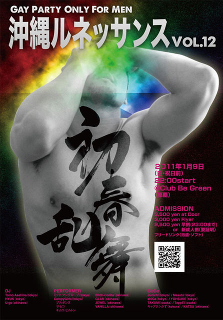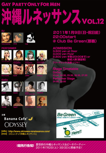 沖縄ルネッサンスvol.12 〜初春乱舞〜(Men Only) 2011年1月9日(日・祝日前)22:00start @Club Be Green(那覇市) ¥3,500- Door ¥3,000- Flyer ¥2,500- 早割(23:00まで)or新成人割(要証明) ★フリードリンク(泡盛・ソフト) DJ ■Tomo Asahina (tokyo) ■HYUK (tokyo) ■U-go (okinawa) PERFORMER ■ミッツ マングローブ (tokyo) ■キャンピーガールズ (tokyo) ブルボンヌ サセコ キムコ ヒルトン ■Bitch-Collita (okinawa) ■GLAN (okinawa) ■JEWEL (okinawa) ■VANILLA (okinawa) GoGo ■Junic