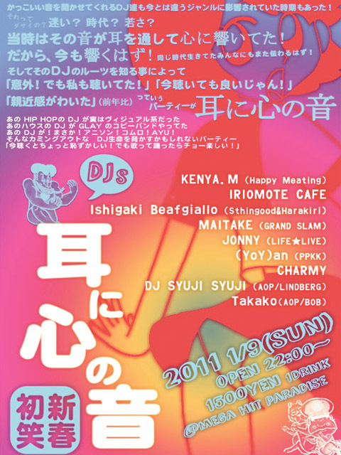 前回大盛況だった恥音 ついに第2回やってしまいます! 新春初笑DJ大喜利!! あのDJが実は昔…!? 耳に心で「恥」ということで 「この曲好きだった、てゆうか踊れる」 「聞くに耐え難い恥ずかしさで思わずニヤリ」 DJたちの懐かしく恥ずかしい選曲で 歌い踊り大笑いPARTY!! ★1/9(sun) ★\1500 1drink ★@MEGA HIT PARADICE ★DJs DJ BODY SYUJI SYUJI(AOP) KENYA.M(HAPPY MEATING/FM) CHARMY ISIGAKI BEAFGIALLO(STHINGOOD&HARAKIRI) MAITAKE(GLAND SLAM) JONNY(LIFE★LIVE) (YoY)an(PPKK) IRIOMOTE CAFE Takako(AOP) ★MEGA HIT PARADICE 石垣