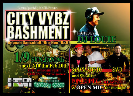 Reggae Dncehall/Hip-Hop/R&B [CITY VYBZ BASHMENT] ******************************* [SOUND] DJ LOUIE BANANA STEREO SAVO POPO JOHNEY a deejay style &OPEN MIC FOR MIDNIGHT!!!!!! ******************************* @FANTASY SPACE(牧志交番向かい) 098-861-3390 [入場料] \1000 with 1drink&Free Awamori [日時] 1/9(sun)祝日前 PM10:00〜