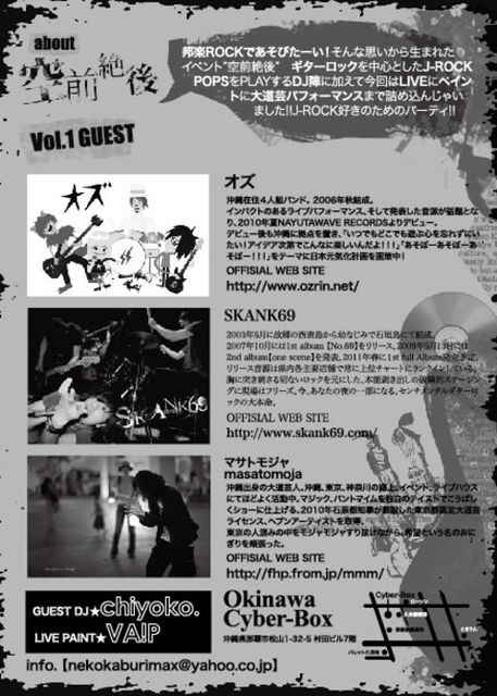 2011年のオズLIVE1本めはこれっっ!! 祝日の前日だから時間を気にせず遊べるね♪ ★邦楽ロックイベント 【空前絶後】Vol.1 2011年1月9日(SUN) ※翌日公休日♪ 【場所】 那覇・Cyber-Box 【時間】 20:30〜3:00 【チケット】 1500円+1DRINK 2DRINK以降泡盛FREE!! (!フライヤー持参で1200円!) ■DJS Eriko(POUND) ZUNARI(SKANK69) MOTOHIDE(Vier、watermelons) CHIKA(ロックの逆襲、DIZZY ROCKARTxxx...) ■GUEST DJ chiyoko. ■LIVE オズ SKANK69 ■Performance マサトモジャ ■LIVE PAINT