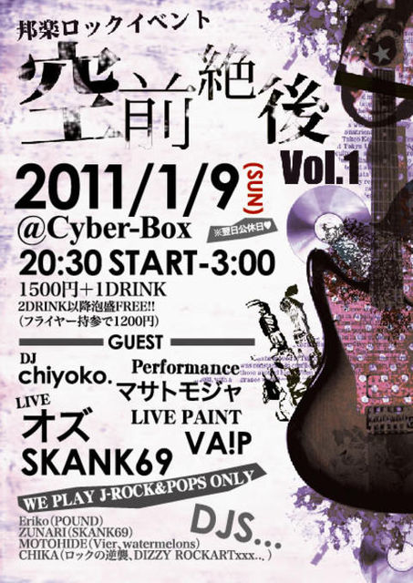 管理人様、告知失礼いたします。 邦楽ROCKであそびたーい! そんな思いから生まれたイベント”空前絶後” ギターロックを中心としたJ-ROCK/POPSをPLAYするDJ陣に加えて今回はLIVEにペイントに大道芸パフォーマンスまで詰め込んじゃいました!! 新年1発目!!J-ROCK好きのためのパーティ!! 邦楽ロックイベント 【空前絶後】Vol.1 2011年1月9日(SUN) ※翌日公休日♪ @Cyber-Box 20:30〜3:00 1500円+1DRINK 2DRINK以降泡盛FREE!! (フライヤー持参で1200円) ◆DJS Eriko(POUND) ZUNARI(SKANK69) MOTOHIDE(Vier、watermelons) CHIKA(ロッ