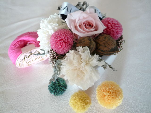 編み物教室のSALON de HIROYO KNIT SALONにてプリザーブドフラワーとかぎ編みで作るリボン、ポンポンを合わせたアレンジメントレッスンを開催します。繊細な発色と肉厚な質感の花材は全て日本のものを使用しております。暖かな毛糸と可憐なプリザーブドフラワーのマッチングをぜひお楽しみ下さい。 ニットとプリザーブドフラワーのアレンジメントでお部屋のコーナーを暖かく演出するとともに、ご希望の方にはヴァレンタインのギフトにぴったりなかぎ編みレッスンでのアレンジメントもご受講頂けます。 申し込み締め切りは開催日前日で1回限定7名のレ