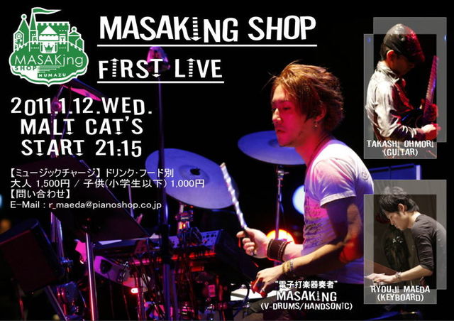 1月12日(水) 『MASAKing Shop』(http://mixi.jp/view_bbs.pl?id=58730937&comm_id=1858913) のFIRST LIVEです 沼津 MALT CAT'Sにて START 21:15 アーティスト MASAKing(V-DRUMS/HANDSONIC) TAKASHI OHMORI(GUITAR) RYOUJI MAEDA(KEYBOARD) MUSICチャージ(ドリンク・フード別) 大人 \1,500 子供(小学生以下)\1,000 お問い合せ r_maeda@pianoshop.co.jp MASAKingブログ…『フライヤー完成』http://ameblo.jp/masaking-asia/image-10744188824-10932271235.html
