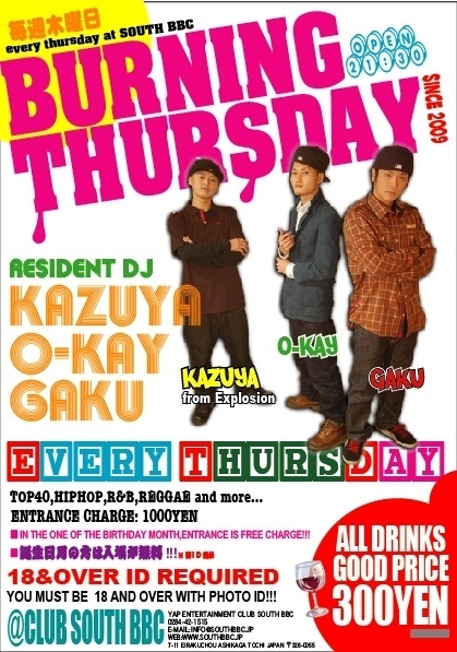 毎週木曜日開催中!Burning Thursday @ Club South BBC 栃木 / 22:00 OPEN / 女性の方は 24:00 まで入場無料!DJs : KAZUYA / O-KAY / GAKU / DEEP 沢山の御来場お待ちしております! http://mixi.jp/view_community.pl?id=2005565 Club South BBC mixiコミュニティ