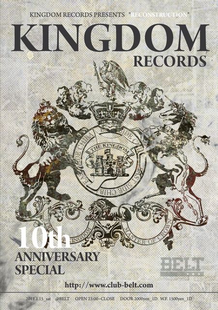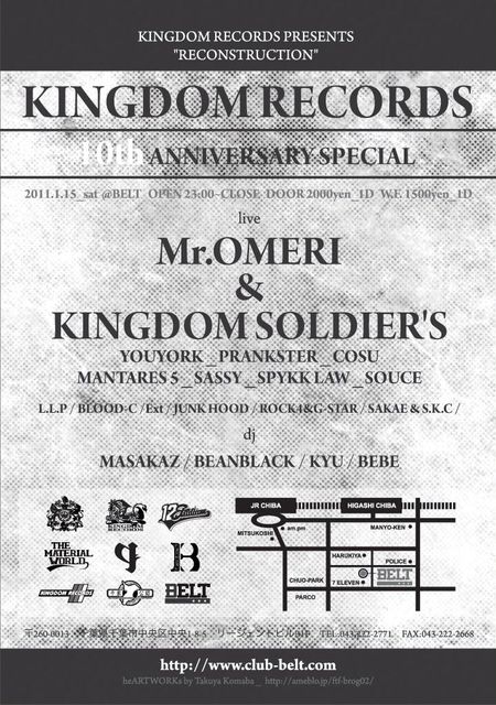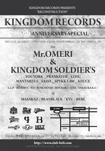 2011.1.15 (sat) RECONSTRUCTION @ BELT KINGDOMRECORDS 10th ANNIVERSARY SPECIAL!!!!!!!!!!!! OPEN 23:00〜CLOSE DOOR ¥2000.1D W.F. ¥1500.1D ★LIVE★ Mr.OMERI & KINGDOM SOLDIER'S YOUYORK、PRANKSTER、COSU、MANTARES 5、SASSY、SPYKK LAW、SOUCE L.L.P / BLOOD-C /Ext / JUNK HOOD / ROCK4&G-STAR / SAKAE & S.K.C ★DJ★ MASAKAZ / BEANBLACK / KYU / BEBE 2011年で10周年を迎えるMr.OMERI率いるキングダムレコーズが千葉のクラブBELTで奇数月レギュラーイベントとして展開する「RECONSTRUCTION」で