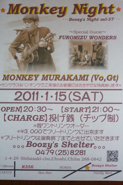 管理人さま告知失礼いたします。 Boozy's Night vol-37 【開催日時】 2011.1.15 (土) OPEN 20:30〜 START 21:00〜 【CHARGE】 投げ銭(チップ制) *要ワンドリンクオーダー *¥3,000でフリードリンクに出来ます *フリードリンクは演奏終了までとなります *今回もモンキーさんのトレードマークであるハンチング&サングラス姿でご来場のお客様には特典付けちゃいます!!! 【開催場所、お問い合わせ】 Boozy's Shelter (ブージーズ・シェルター)