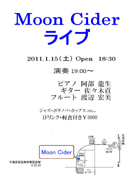 遅くなりましたが、今年もよろしくお願いいたします。 新年最初のMoon Cider は1月15日です。 諸事情により、来月からは第2土曜日にシフトいたします。。。 時間の変更はありません。19時からライブ演奏です。 今年もMoon Cider をよろしく〜!!!