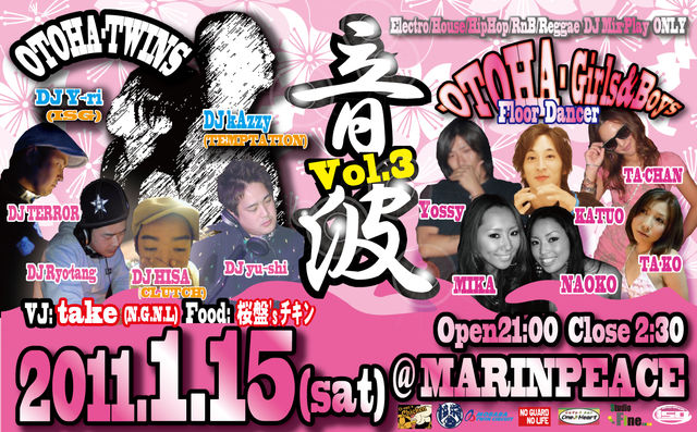 年始1発目のPARTYはこれ! DJ ONLY オールジャンルPARTY!!!! 入場無料なので気軽に遊びに来て下さい。。 音波 Vol.3@Marinpeace(茂原) DAY:2011.1.15(土) Open:21:00 Close:2:30 入場無料!!!!!! 住所: ○場所 JR本納駅から徒歩8分 ○地図 茂原市法目787-5(茂原市本納R128号沿い) Marine Peace http://www.marine-peace.join-us.jp/i/ [DJ] TERROR Yu→shi HISA(CLUTCH) Ryo-tang Otoha-Twins[kAzzy(Temptation)&Y→ri(isg)] [音波フロアダンサー] NAOKO(E-Class) MIKA TA-chan