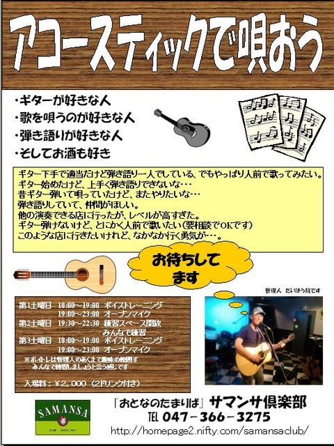 1月15日 「アコースティックで唄おう」部 開催です 18:00〜19:00 ボイストレーニング 19:00〜23:00 オープンマイク ボイストレーニングは管理人のあくまで趣味の範囲です、ご了承ください オープンマイク前の声帯のウオーミングUPにもなります 下記に当てはまる方来てください ギター下手で適当だけど弾き語り一人でしている、でもやっぱり人前で歌ってみたい。 ギター始めたけど、上手く弾き語りできないな・・・ 昔ギター弾いて唄っていたけど、またやりたいな・・・ 弾き語りしていて、