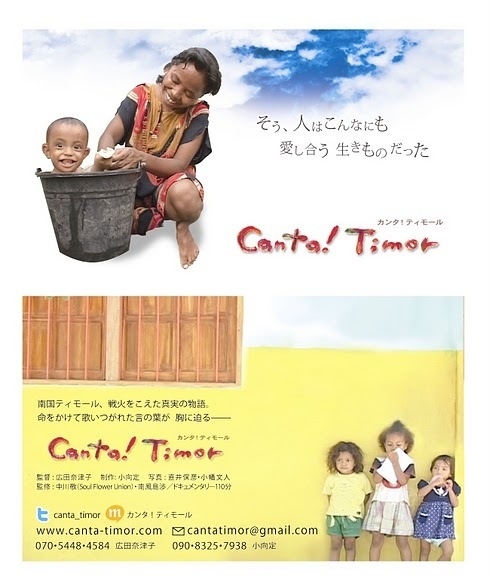 東チモールを舞台にした音楽ドキュメンタリー映画「カンタティモール」の試 写会と監督によるトークが、今週末に京都・五条の「ひと・まち交流館」で開 かれます。 この映画は去年(2010)の山水人でも9.20の夜中に上映されましたが、スタッ フをはじめ見れなかった人も多いと思うので、まだの方はこの機会にぜひお勧 めします。 東チモールはインドネシアによって24年間占領され、その間に住民の3人に1 人が殺され、民家の9割が破壊されたといわれます。その他にも拷問・レイプ などすさまじい暴力・虐殺・破壊行為を受け、国際的