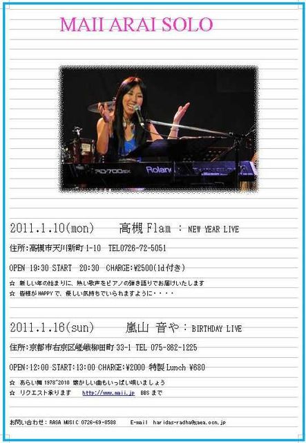 場所:嵐山 音や http://www.k2.dion.ne.jp/~otoya/top.htm 住所:京都市右京区嵯峨柳田町33-1 TEL 075-862-1225 OPEN:12:00 START:13:00 CHARGE:\2000 特製Lunch \680 ☆ あらい舞1978 - 2010 懐かしい曲もいっぱい唄いましょう ☆ リクエスト承ります あらい舞 Oficial Site 【BBS】 まで http://eigocall.sakura.ne.jp/maii/cgi/bbs/sbu2_bbs.cgi お問い合わせ:RASA MUSIC 0726-69-8588 E-mail:haridas-radha@gaea.ocn.jp