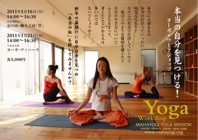 本当の自分を見つける! ヨーガ・ワークショップ 本当に大切なもの、本当の自分って いったい何なんだろう? 日々この社会で生活していく中で 一度はこのような疑問を感じたり 自分の生き方についてふと立ち止まって 考えたことのある人は多いのではないでしょうか? 新年の幕開けに自分自身を見つめ 「本当の私」を探してみませんか? 2011年1月16日(日) 14:00〜16:30 JR京都駅近く 京の山・杣人工房「空」 2011年1月23日(日) 14:00〜16:30 千本丸太町 ヨーガ・ヴィハーラ 各3,000円 Contents ・自分のあるべ