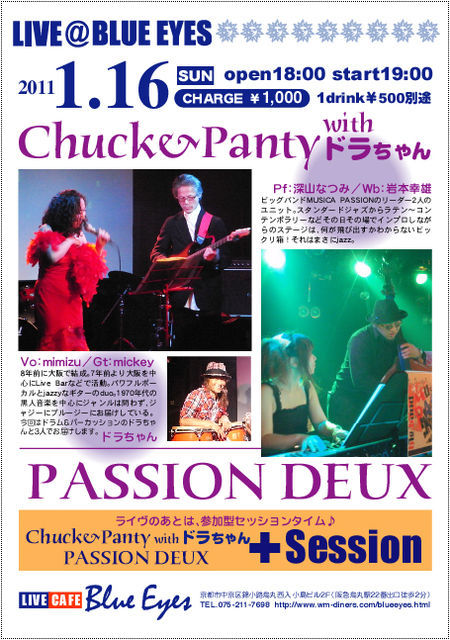 1月16日(日) open18:00 start19:00 charge ¥1000(1drink¥500別途) 出演:Chuck&Panty withドラちゃん / PASSION DEUX ツーマンライヴのあとは、フリースタイルジャムセッション ♪Chuck&Panty with ドラちゃん Gt:mickey/Vo:mimizu。8年前に大阪で結成。7年前より大阪を中心にLive Barなどで活動。パワフルボーカルとjazzyなギターのduo。1970年代の黒人音楽を中心にジャンルは問わず、ジャジーにブルージーにお届けしている。 今回はドラム&パーカッションのドラちゃんと3人でお届けします。 ♪PASSION D